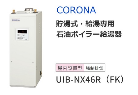 従来の給湯ボイラーがコロナ UIB-NX46なので、同じコロナの後継機種 UIB-NX46R-FK(貯湯式・給湯専用 石油ボイラー給湯器)に買い換えです。