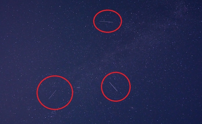 天の川を見上げてると、流れ星が何度も流れるのを見れる、写真を確認すると、何んと流れ星が同時に3個写ってた。(^_-)-☆
